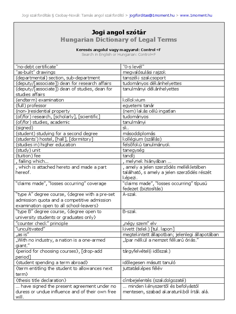 Az egyes témáknál az adott területen leggyakrabban használt szerződések találhatóak angol nyelven rendszerezett formában.