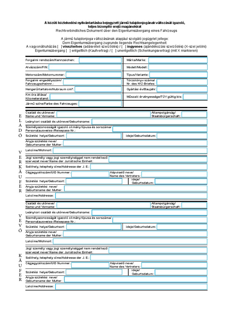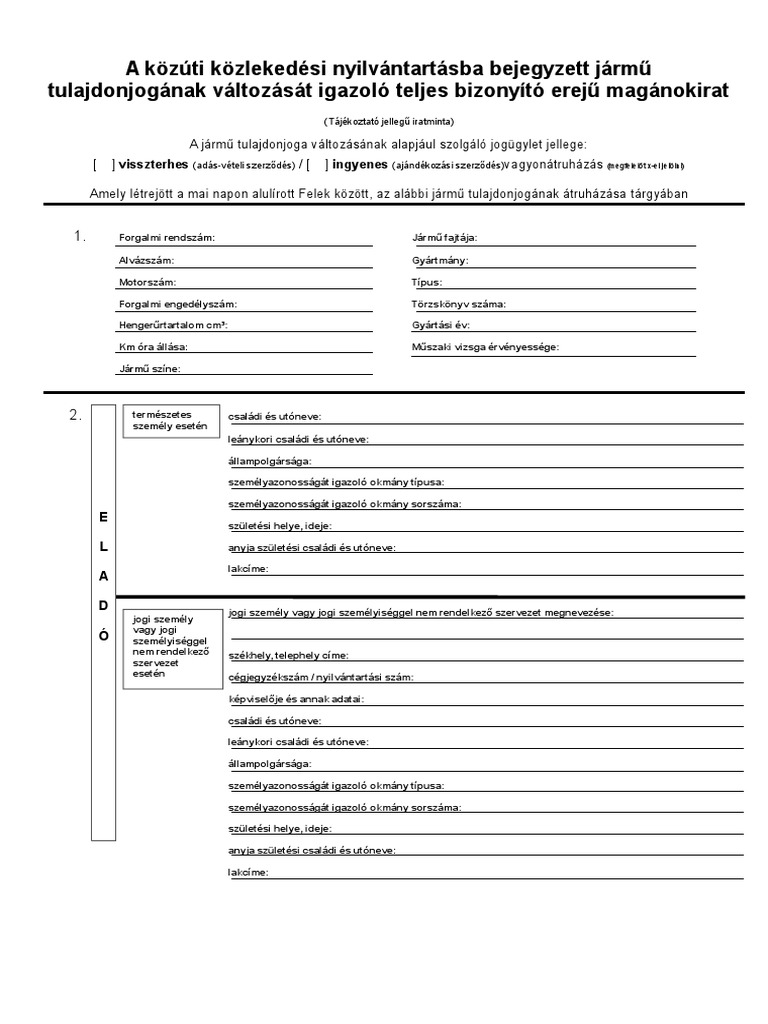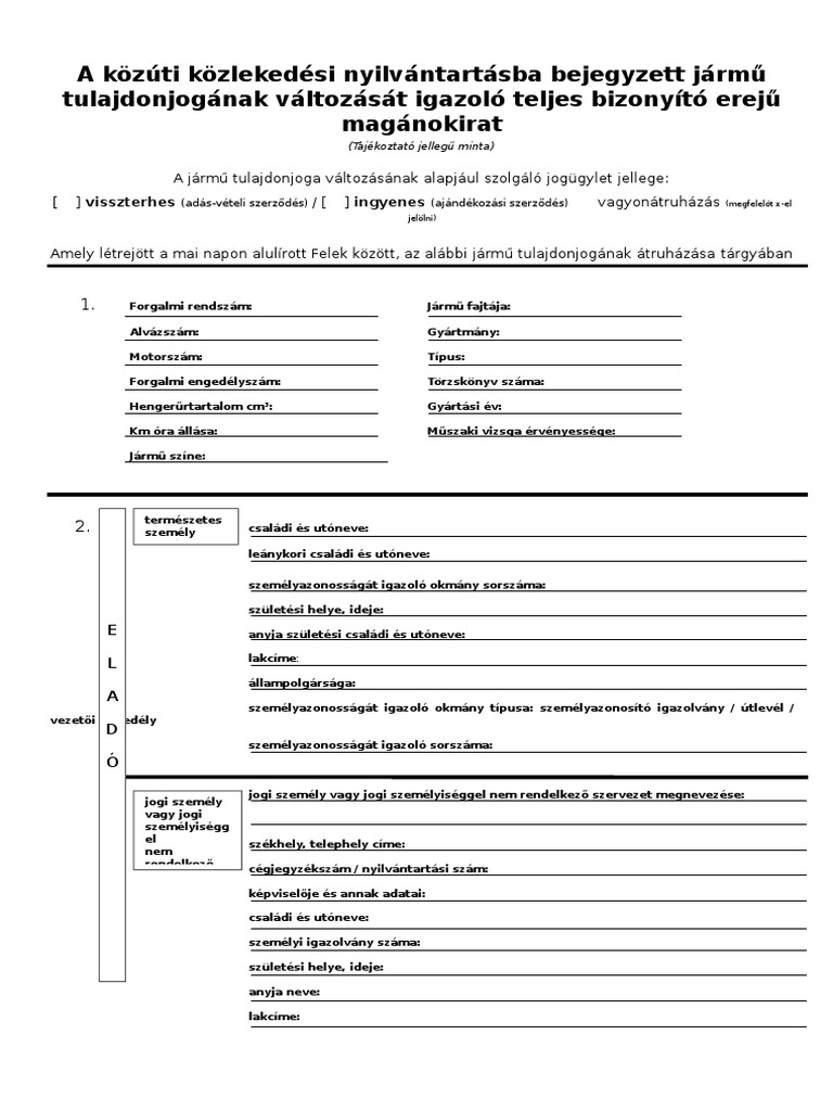 A közúti közlekedési nyilvántartásba bejegyzett jármű tulajdonjogának változását igazoló teljes. A közúti közlekedési nyilvántartásba bejegyzett járm ő tulajdonjogának változását igazoló teljes bizonyító erej ő magánokirat a járm ő tulajdonjoga változásának alapjául szolgáló jogügylet jellege. évi lxxxiv törvényben el őírt bejelentési kötelezettség teljesítése érdekében a közúti közlekedési nyilvántartásba bejegyzett járm ű tulajdonjogának illetve üzembentartó személyének változását igazoló teljes bizonyító erej ű magánokiratnak a közlekedési igazgatási eljárásban történ ő. A közúti közlekedési nyilvántartásba bejegyzett jármű tulajdonjogának változását igazoló teljes bizonyító erejű magánokirat rechtverbindliches dokument über den eigentumsübergang eines fahrzeugs a jármű tulajdonjoga változásának alapjául szolgáló jogügylet jellege. Visszterhes ingyenes 1 vagyonátruházás amely létrejött egyrészről természetes személy esetén.