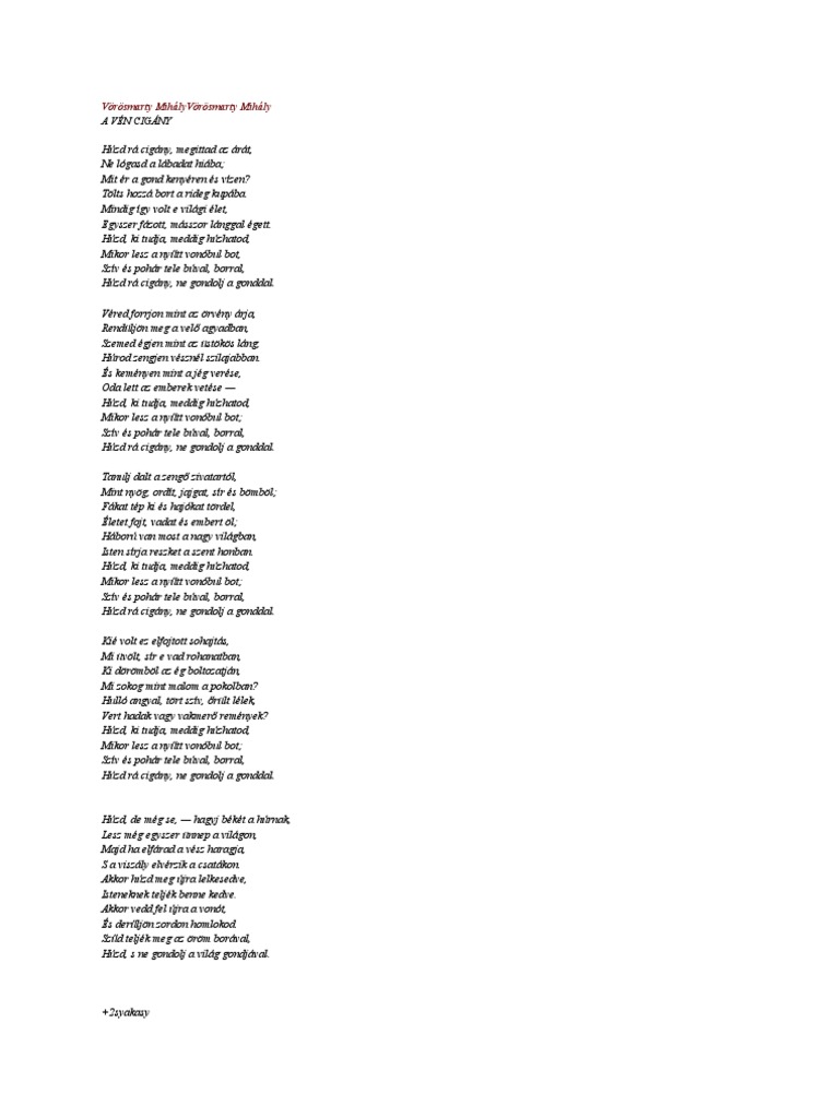 Véred forrjon mint az örvény árja rendüljön meg a velő agyadban szemed égjen mint az üstökös láng húrod zengjen vésznél szilajabban és keményen mint a jég verése odalett az emberek vetése. Húzd rá cigány megittad az árát ne lógasd a lábadat hiába. Csak a könny csak a könny csak a könny hull s nem kérdi mire jó. A vén cigány 1854 nyarán július augusztusban íródott.