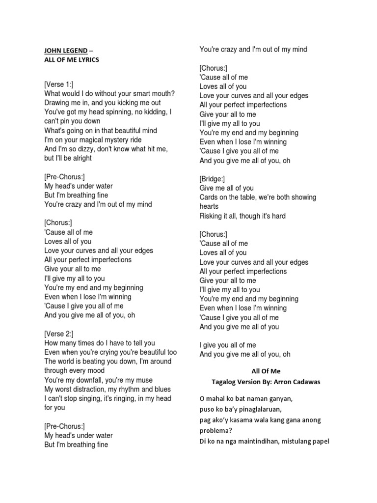 Give me all of you cards on the table we re both showing hearts risking it all though it s hard cause all of me loves all of you love your curves and all your edges all your perfect imperfections give your all to me i ll give my all to you you re my end and my beginning even when i lose i m winning cause i give you all of me and you give.