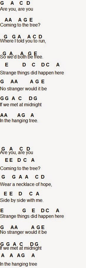 Am f strange things did happen here am d no stranger would it be am dm if we met at midnight e g am in the hanging tree. Verse 4 am dm are you are you am e coming to the tree am dm wear a necklace of hope g am side by side with me. In the hanging tree are you are you coming to the tree. Am f strange things did happen here am e no stranger would it seem am dm if we met up at midnight e am in the hanging tree.