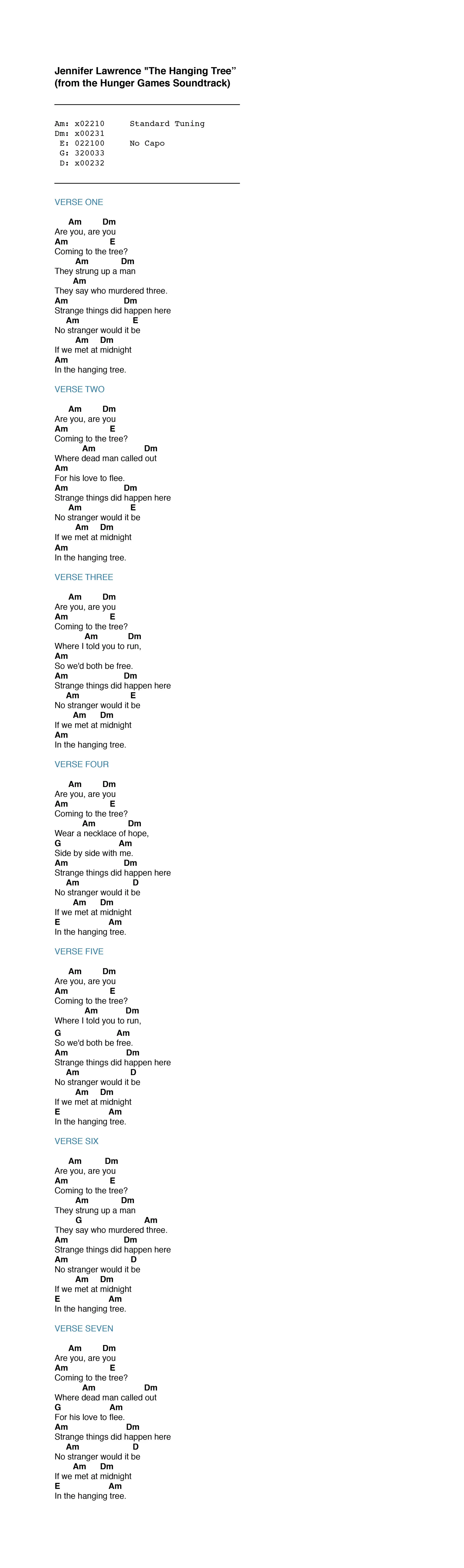 Am f strange things did happen here am d no stranger would it be am dm if we met at midnight em am in the hanging tree. Am dm are you are you am e7 coming to the tree am dm where i told you to run g am so we d both be free. Guitar chords lyrics included in tab to play the hanging tree. Strange things did happen here no stranger would it be if we met at midnight in the hanging tree.