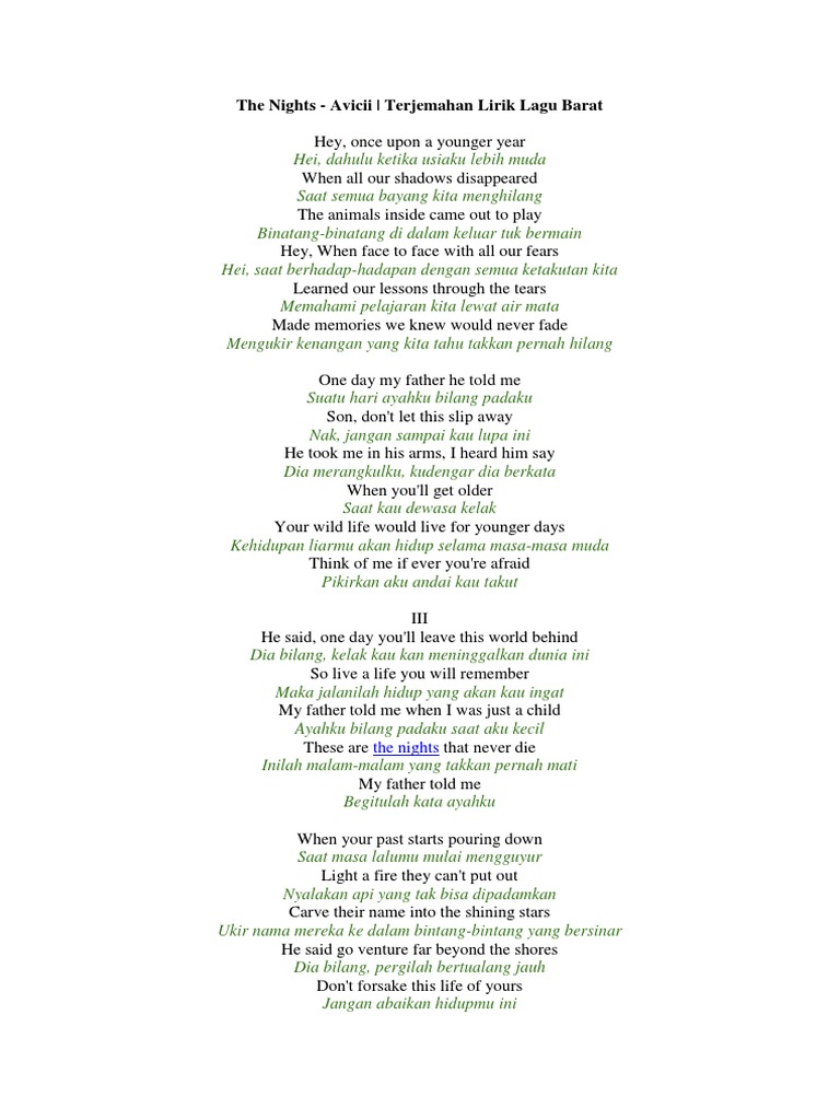 Silahkan baca terjemahan lirik lagu the night avicii ini selengkapnya di terjemahan lirik 7. Hey once upon a younger year when all our shadows disappeared the animals inside came out to play hey hey went face to face with all our fears learned our lessons. The nights was released as a digital download by prmd music and universal island on avicii s the days nights ep on the 1st ot december 2014. Terjemahan lirik lagu the nights avicii dalam kesempatan kali ini admin ingin membahas mengenai arti lirik lagu the nights.