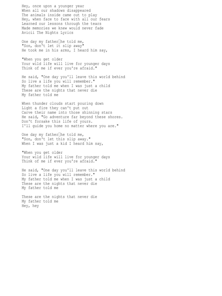 Avicii the nights lyrics. Once upon a younger year when all our shadows disappeared the animals inside came out to play went face to face with all our fears learned o. Http po st thedaysnightsepspotify turn. Follow our spotify playlists. Avicii the nights lyrics.