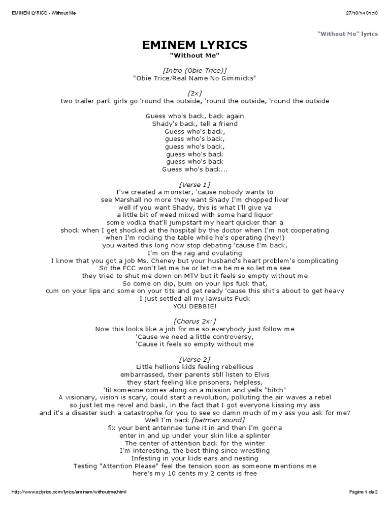 Eminem without me lyrics az. Eminem review the song 0 without me lyrics obie trice obie trice real name no gimmicks record scratches beat changes two trailer park girls go round the outside round the outside round the outside. Eminem eminem without me dirty lyrics. Now this looks like a job for me so everybody just follow me cause we need a little controversy cause it feels so empty without me i said this looks like a job for me so everybody just follow me cause we need a little controversy cause it feels so empty without me a tisk it a task it i ll go tit for tat with anybody who s talking this shit. Halsey lyrics without me found you when your heart was broke i filled your cup until it overflowed took it so far to keep you close keep you close i was afraid to leave you on your own i said i d catch you if you fall fall and if they laugh then fuck em all all.