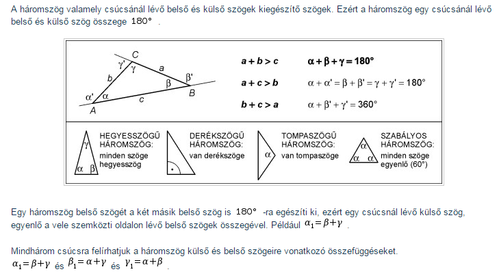 Ebből következik hogy a háromszög két szögének ismeretében meg lehet határozni a harmadikat. A derékszögű háromszög területe és kerülete. Homorúszöge nem lehet egy háromszögnek. A háromszög belső szögeinek összege 180 fok.