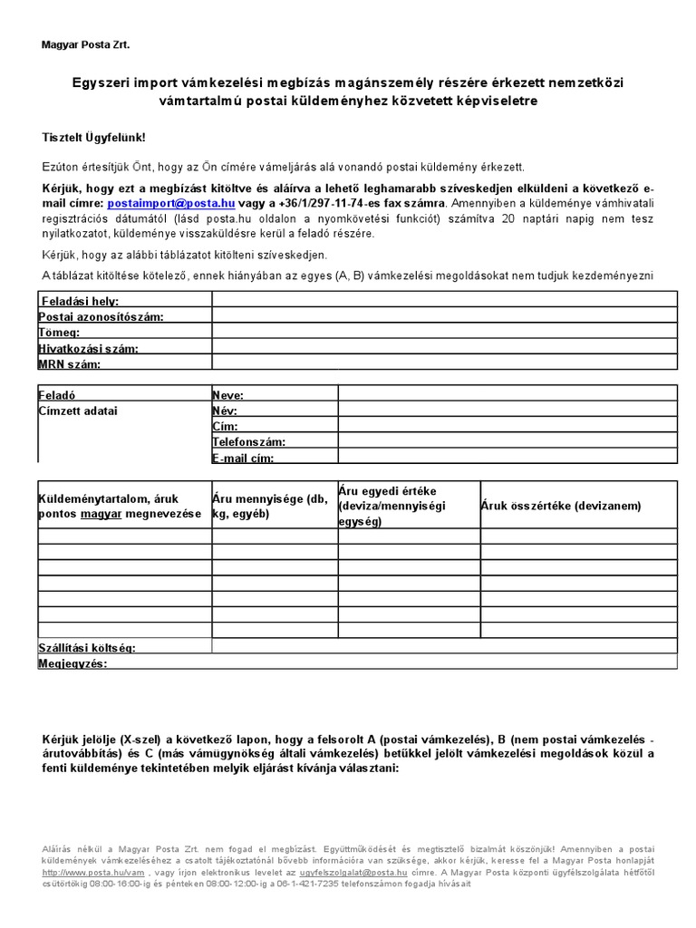 Mobil 20 30 70 vagy budapesti 1 telefonszám esetén 7 számjegyű telefonszámot adjon meg. 28 32 stb esetén 6 számjegyű telefonszámot adjon meg. A küldeményt a magyar posta kézbesíti miután a címzett a vámterhet és a postai vámügynöki szolgáltatás díját kifizeti. A alapján jogkövetkezmény az ön részére nem állapítható meg.