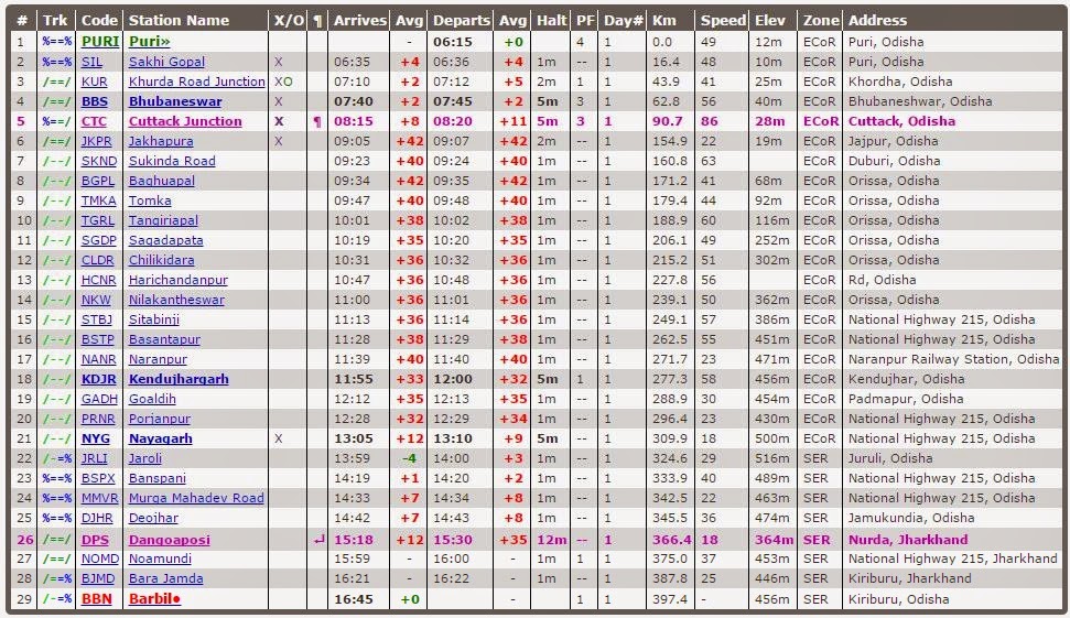 Find the distance travelled during a train journey from tatanagar junction to puri also get the list of all the railway stations in between.
