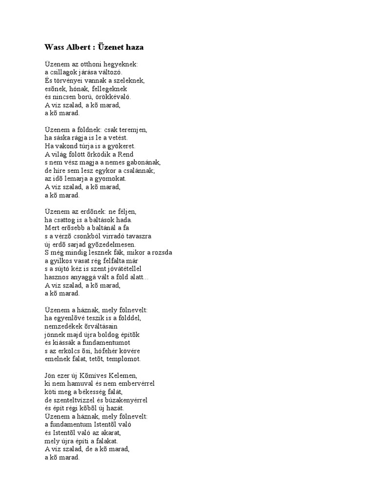Wass albert üzenet haza. üzenet haza közzétette foszerkeszto 7 év ezelőtt. Csak teremjen ha sáska rágja is le a vetést. A csillagok járása változó és törvényei vannak a szeleknek esõnek hónak fellegeknek és nincsen ború örökkévaló. A csillagok járása változó.
